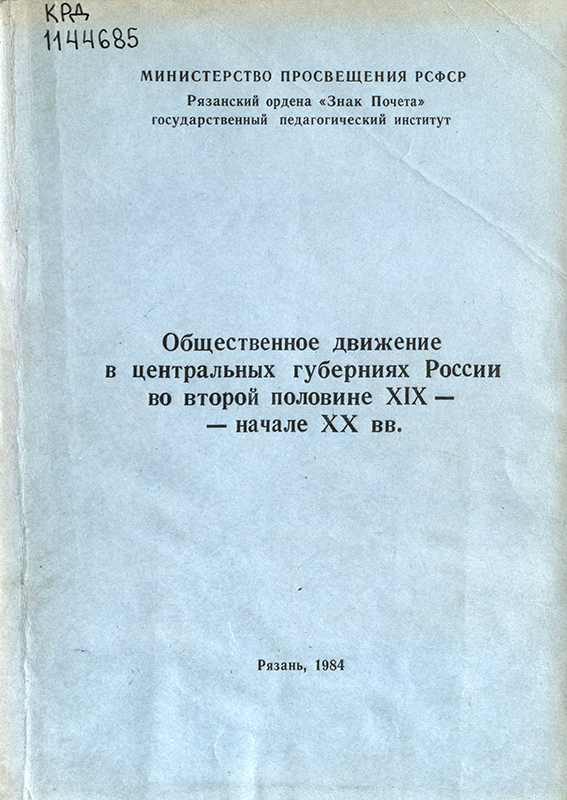 - Общественное движение в центральных губерниях России во второй половине XIX – начале XX века : межвуз. сб. науч. тр. / РГПИ им. С. А. Есенина ; редкол.: И. П. Попов (отв. ред.) [и др.]. – Рязань : РГПИ, 1984. – 167 с.