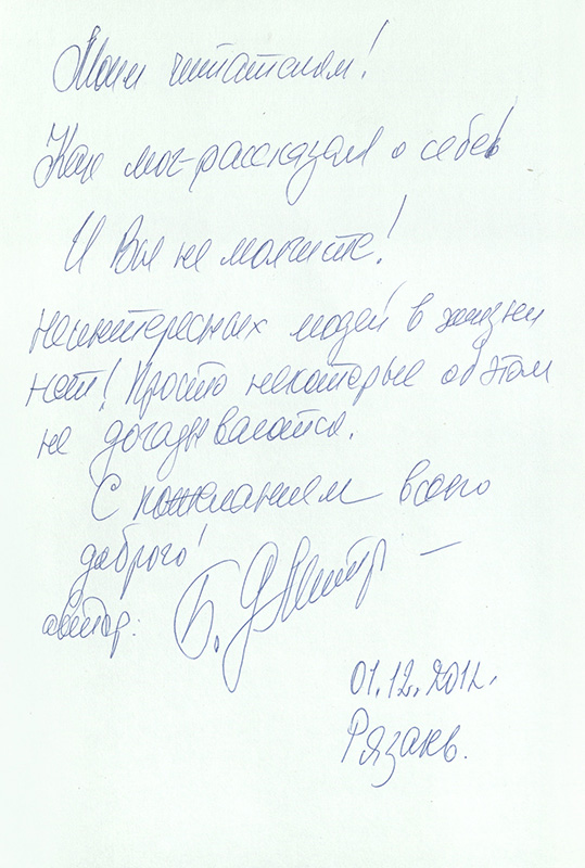 Дарственные надписи украшают два экземпляра книги «Наедине с минувшим»: «Моим читателям! Многое в жизни пройдет, – а книга останется! Вам с ней жить! Вам её хранить! С уважением Б. Дмитриев», «Моим читателям! Как мог, рассказал о себе! И Вы не молчите! Неинтересных людей нет! Просто некоторые об этом не догадываются. С пожеланием всего доброго! Автор Б. Дмитриев. 01.12.2012. Рязань».