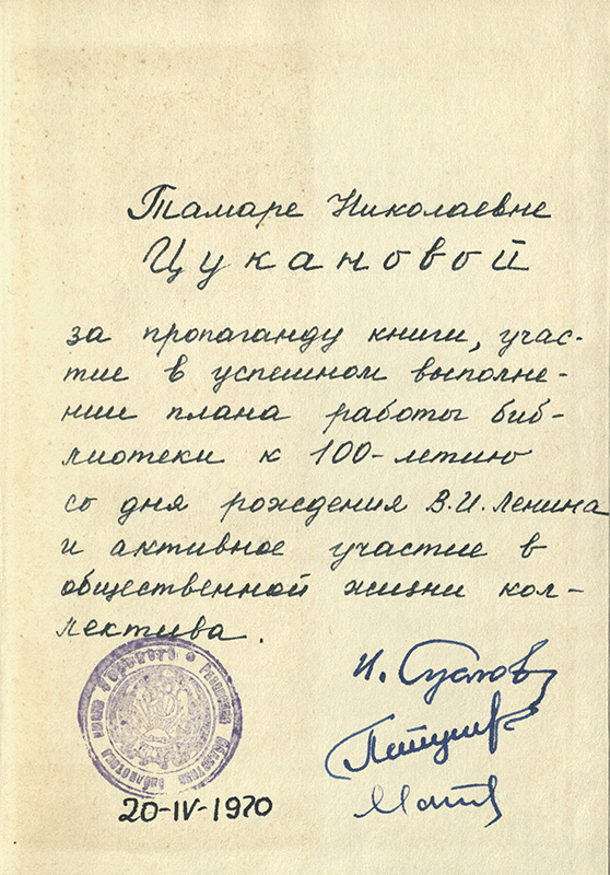В «Коллекции автографов» Рязанской областной библиотеки хранится книга Г. Шмитта «Рембрант» из серии «Жизнь в искусстве» с гербовой печатью библиотеки с автографом директора библиотеки И.М. Суслова и дарственной надписью «Тамаре Николаевне Цукановой за пропаганду книги, участие в успешном выполнении плана работы библиотеки к 100-летию со дня рождения В.И. Ленина и активное участие в общественной жизни коллектива. 20.04.1970». Инскрипт адресован Тамаре Николаевне Цукановой (1932–2023), ветерану Рязанской областной библиотеки, организатору нотно-музыкального отдела, инициатору создания и руководителю клуба «ОЛИМП», музыкальному краеведу и просветителю, заслуженному работнику культуры Российской Федерации, подарившей библиотеке часть своей книжной коллекции.