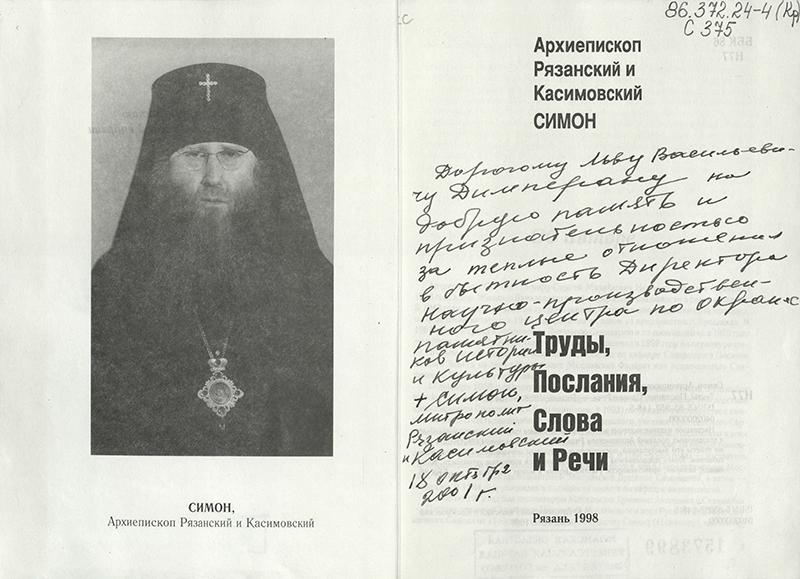 В «Коллекции автографов» Рязанской библиотеки имени Горького хранится книга архиепископа Симона (Новикова) «Труды, Послания, Слова и Речи» с автографом автора. Дарственная надпись адресована историку и краеведу Льву Васильевичу Димперану (1931–2007).