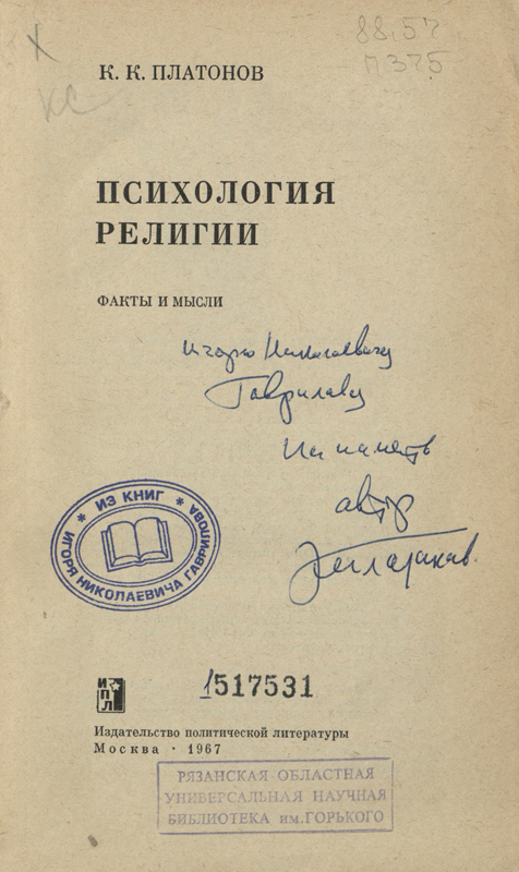 В «Коллекции автографов» библиотеки им. Горького хранятся книги Константина Платонова с автографами автора, которые адресованы рязанскому ученому-литературоведу Игорю Николаевичу Гаврилову (1926 – 2003). Познакомиться с автографами можно на файл-изображениях.