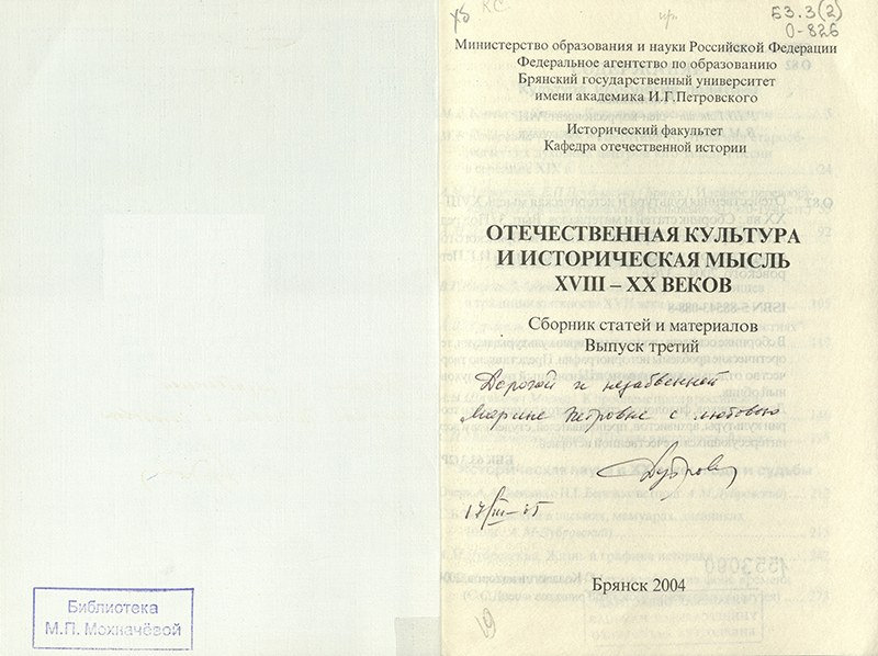 - Отечественная культура и историческая мысль XVIII–XX веков : сборник статей и материалов / М-во образования и науки РФ, Федер. агентство по образованию, Брян. гос. ун-т им. акад. И. Г. Петровского, Ист. фак., Каф. отечественной истории ; [отв. ред. А. М. Дубровский]. – Брянск : Изд-во Брян. гос. ун-та им. акад. И. Г. Петровского, 2004. Вып. 3. – 2004. – 374 с.