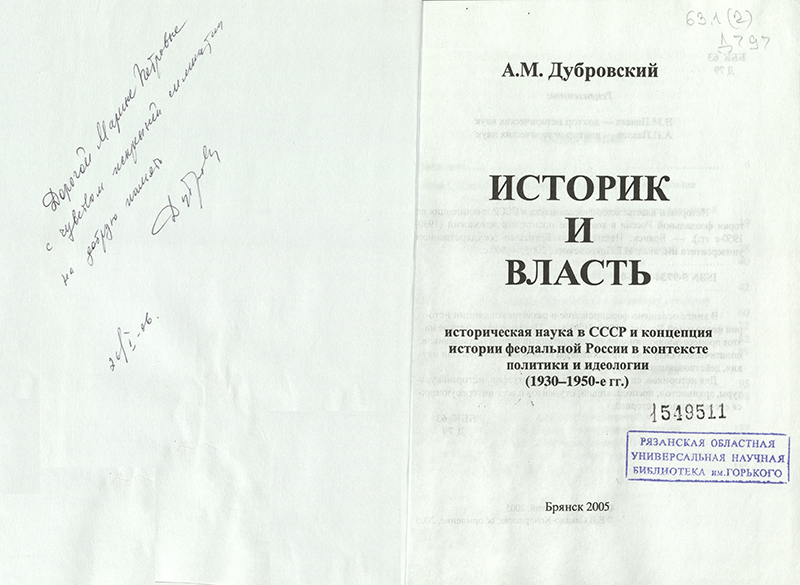 В «Коллекции автографов» областной библиотеки хранятся несколько книг профессора А.М. Дубровского, в том числе три издания с его дарственными надписями. Это сборник статей и материалов «Отечественная культура и историческая мысль XVIII–XX веков». Вып. 3. (Брянск, 2004), «С.В. Бахрушин и его время» (Москва, 1992), «Историк и власть: историческая наука в СССР и концепция истории феодальной России в контексте политики и идеологии (1930–1950-е гг.)» (Брянск, 2005). Инскрипты адресованы Марине Петровне Мохначевой (1952 – 2014) – российскому историку, доктору исторических наук, профессору Историко-архивного института Российского государственного гуманитарного университета. В фонд Рязанской областной библиотеки имени Горького коллекция книг М.П. Мохначевой поступила в 2015 г.