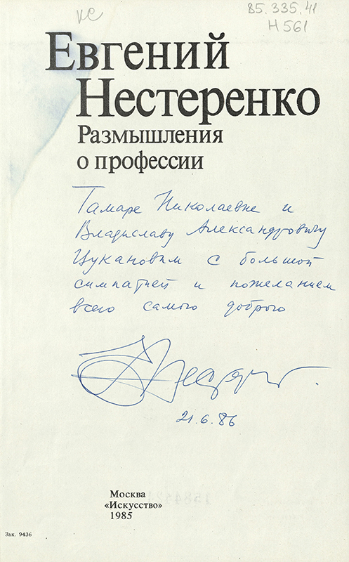 В «Коллекции автографов» Рязанской библиотеки имени Горького хранится книга Е.Е. Нестеренко «Размышления о профессии» с автографом автора. Дарственная надпись адресована сотруднице библиотеки Тамаре Николаевне Цукановой, которая в свою очередь подарила книгу библиотеке.