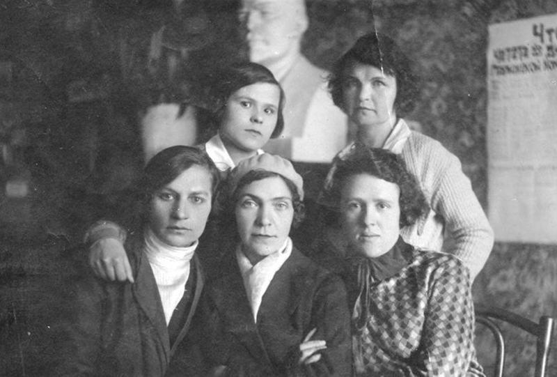 Стоят: Тимошина Ольга Михайловна, заведующая абонементом, директор библиотеки (1941–1946); Акинин И.В., бухгалтер (?); Грацианская Антонина Алексеевна – заведующая Центральной библиотекой имени Горького (1935–1938), методист-инструктор, заведующая методическим кабинетом (1938–1942).