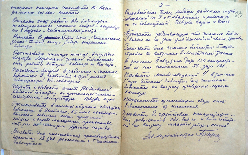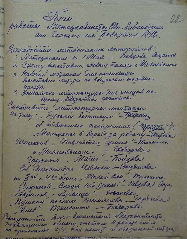 - План работы библиотеки на 1942 г., нач. 1942 – оконч. 1942 : на 44 л. / Ряз. обл. б-ка им. Горького, общая канцелярия // ГАРО. Ф. Р-5829. Оп.1. Д. 6. Л. 22–23.