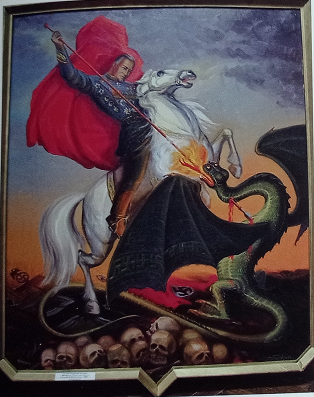 Одной из значимых работ из цикла о войне стал стилизованный в картину-икону Георгия Победоносца на белом коне портрет легендарного героя Великой Отечественной войны Маршала Советского Союза Г.К. Жукова.