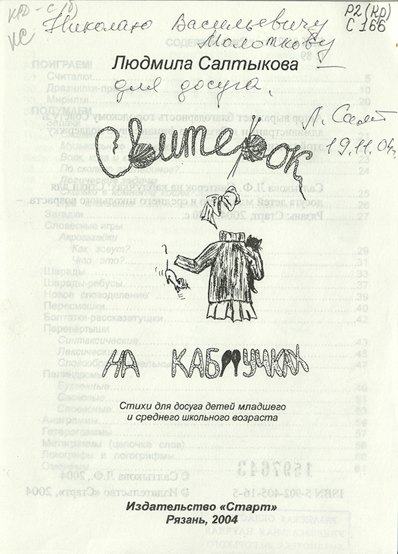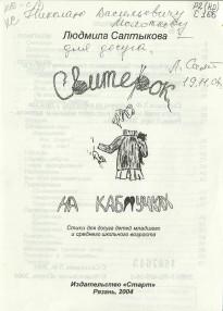 - Салтыкова Л. Ф. Свитерок на каблучках : стихи для досуга детей младшего и среднего школьного возраста / Л. Салтыкова. – Рязань : Старт, 2004. – 79 с. : ил. Экз. № 1597643 с автогр. авт.