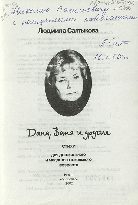 - Салтыкова Л.Ф. Даня, Ваня и другие : стихи : для дошкольного и младшего школьного возраста / Л. Салтыкова ; [иллюстрации: Е. В. Дыкина и др.]. – Рязань : Узорочье, 2002. – 47 с. : ил., портр.