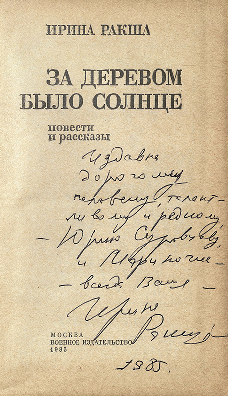 - Ракша И. Е. За деревом было солнце : повести и рассказы / И. Ракша; худож. А. Ю. Ракша. – Москва : Воениздат, 1985. – 348 с. : ил.