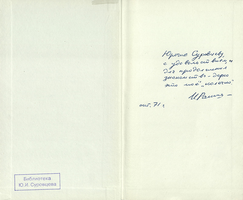 В «Коллекции автографов» Рязанской областной библиотеки хранятся две книги с дарственными надписями Ирины Евгеньевны Ракши, адресованные Юрию Ивановичу Суровцеву (1931–2001) – литературоведу, критику, переводчику, главному редактору журнала «Литературное обозрение», секретарю правления Союза писателей СССР, первому секретарю Союза писателей Москвы. Книги поступили в фонд главной библиотеки рязанского региона в 2018 г. в составе книжной коллекции Ю.И. Суровцева. В сборнике рассказов «Катилось колечко» есть инскрипт: «Юрочке Суровцеву с удовольствием и для продолжения знакомства дарю это мое “колечко” И. Ракша окт.1971 г.». На титульном листе книги «За деревом было солнце» надпись: «Издавна дорогому человеку, талантливому и родному – Юрию Суровцеву и Мариночке. Всегда ваша – Ирина Ракша. 1985».