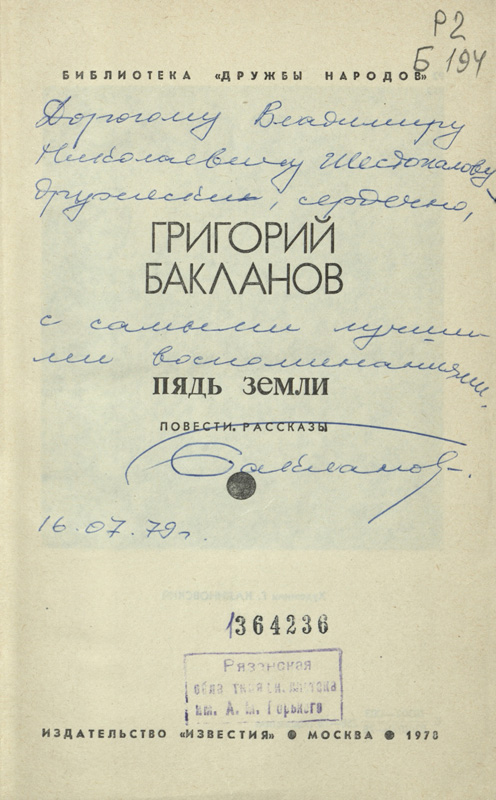 В «Коллекции автографов» в фонде библиотеки им. Горького хранится книга Г. Бакланова «Пядь земли» с автографом на титульном листе книги: «Дорогому Владимиру Николаевичу Шестопалову – дружески, сердечно, с самыми лучшими воспоминаниями». Дарственная надпись адресована В.Н. Шестопалову – партийному работнику, секретарю Рязанского обкома КПСС по идеологии, библиофилу. В 1995 году Владимир Николаевич передал эту книгу в дар нашей библиотеке.