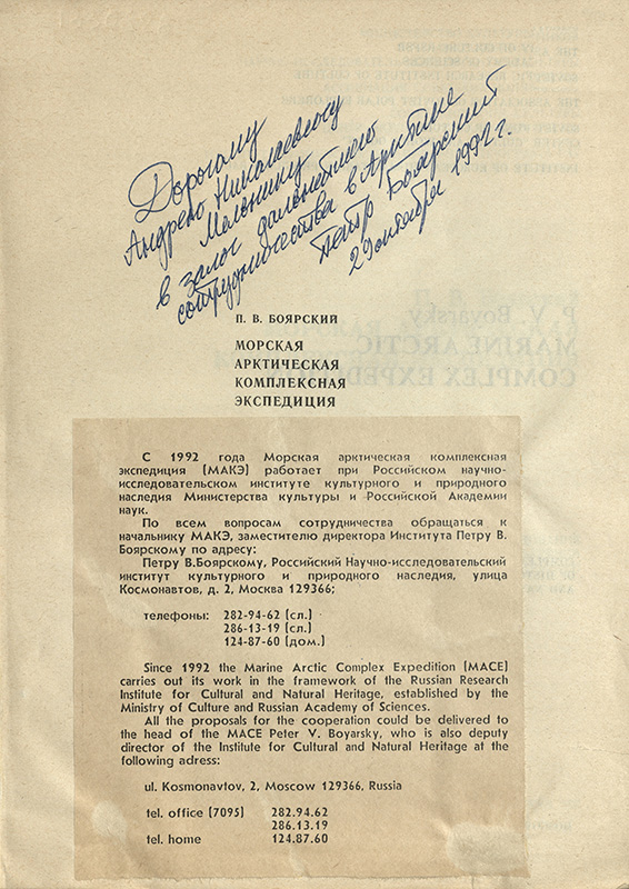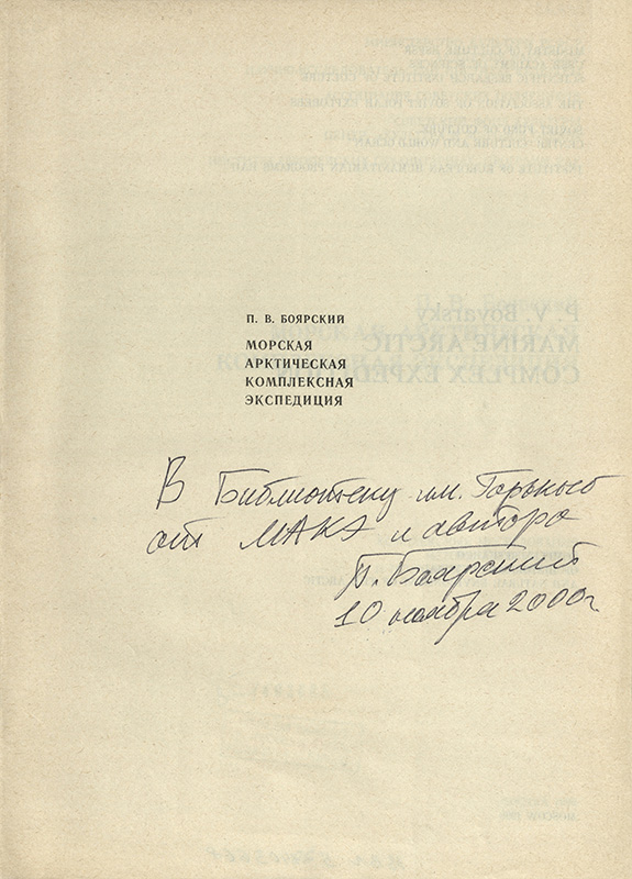 - Боярский П. В. Морская арктическая комплексная экспедиция : комплекс. исслед. ист.-культ. и природ. среды Арктики / П. В. Боярский ; М-во культуры РСФСР, АН СССР, НИИ культуры и др. – Москва : НИИК, 1990. – 80 с.