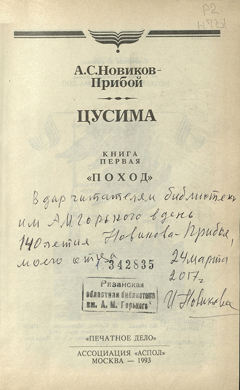 На книге «Цусима» (1993) есть инскрипт: «В дар читателям библиотеки им. Горького в день 140-летия Новикова-Прибоя, моего отца 24 марта 2017 г.»