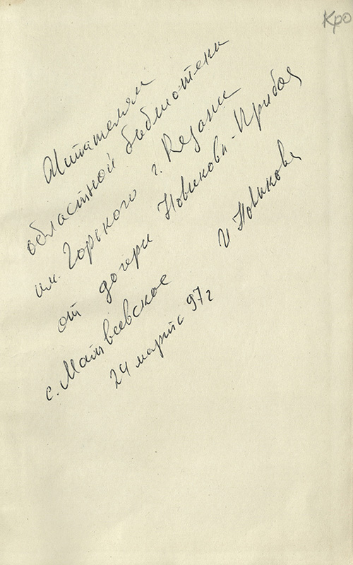 Книга повестей и рассказов А.С. Новикова-Прибоя (1988) была подарена сотруднику читального зала областной библиотеки с надписью: «На доброе знакомство и в благодарность за гостеприимство. 24.03.2007», издание подарено в библиотечный фонд.