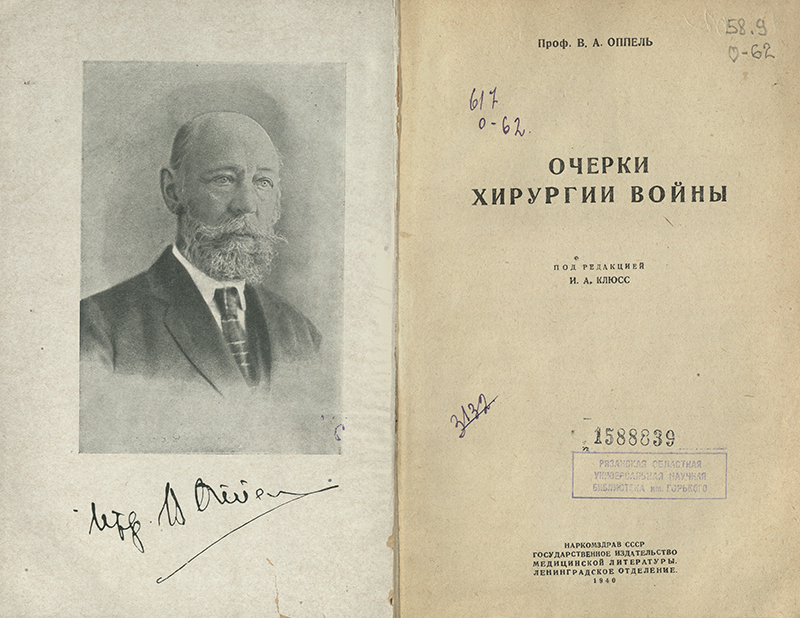 В фонде Рязанской областной библиотеки имени Горького хранятся книги В.А. Оппеля, поступившие в наш фонд из Рязанской областной научной медицинской библиотеки: «Коллатеральное кровообращение» (1911), «Самопроизвольная гангрена» (1923), «Эндокринологические хирургические наблюдения» (1926), «Организация и работа в хирургическом отделении» (1926), «Самопроизвольная гангрена как гиперадреналиннэмия» (1928), «Курс клинических лекций по частной хирургии» (1930), «Лекции по клинической хирургии и клинической эндокринологии для хирургов» в 2 тетрадях (1929-1931), «Очерки хирургии войны» (1940).