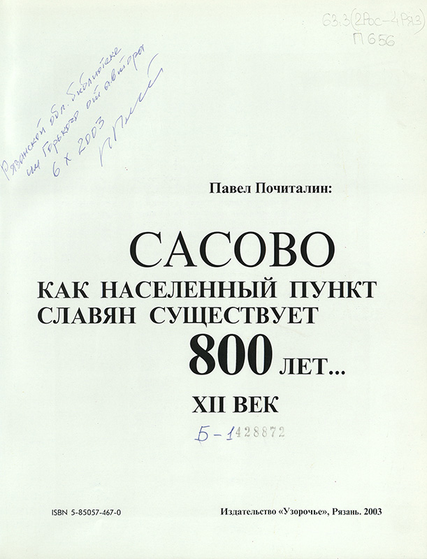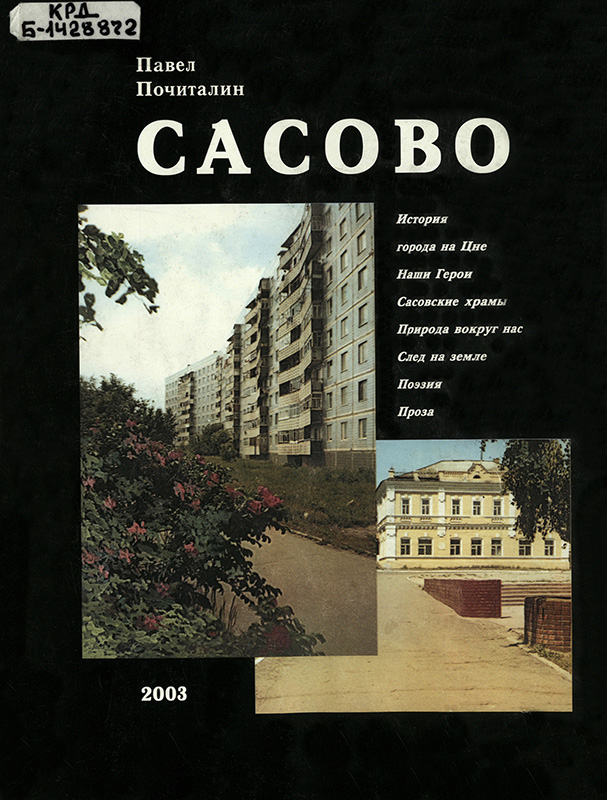 - Почиталин П.А. Сасово как населённый пункт славян существует 800 лет... XII век : [историко-литературный фотоальбом / автор – сост.] П. Почиталин ; [ред. И. Северцева]. – Рязань : Узорочье, 2003. – 301 с. : ил., цв. ил., портр.