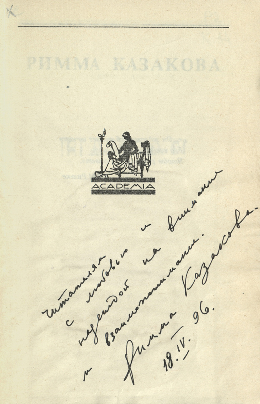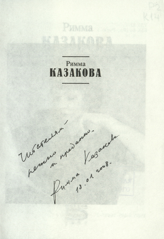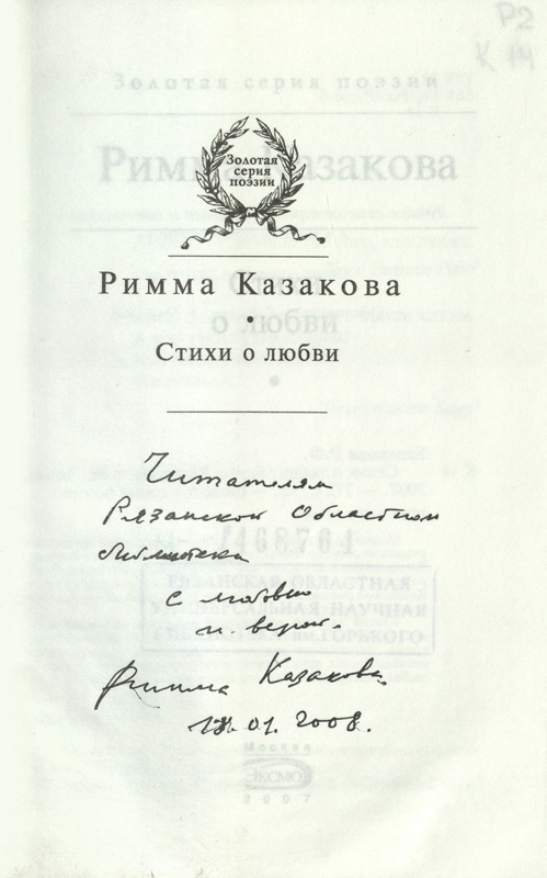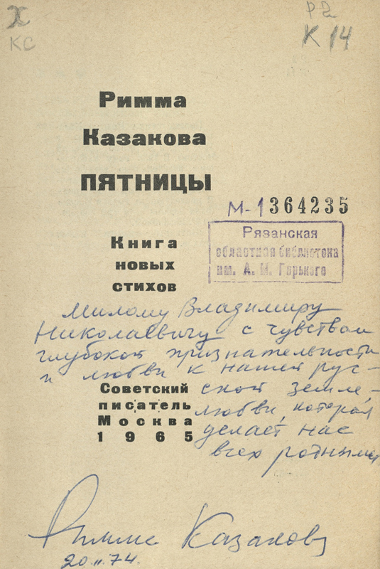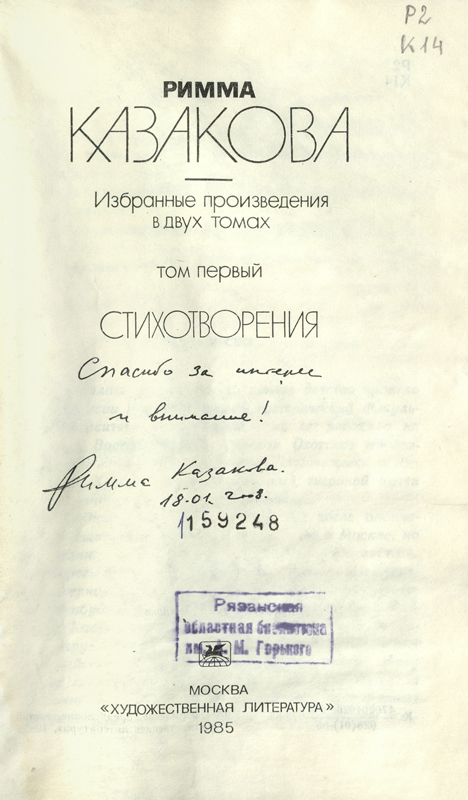 В «Коллекции автографов» библиотеки имени Горького хранятся книги Риммы Казаковой с автографами поэтессы. Познакомиться с дарственными надписями можно на скан-изображениях.