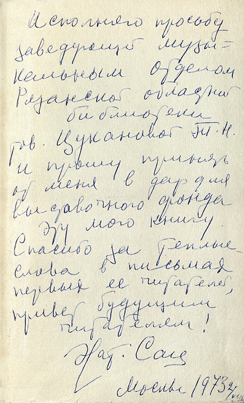 В «Коллекции автографов» Рязанской областной универсальной научной библиотеки имени Горького хранится экземпляр книги Наталии Ильиничны Сац «Новеллы моей жизни» с ее дарственной надписью: «Исполняю просьбу заведующей музейным отделом Рязанской областной библиотеки тов. Цукановой Т.Н. и прошу принять от меня в дар для выставочного фонда эту мою книгу. Спасибо за теплые слова в письмах первых её читателей, привет будущим читателям! Нат. Сац. Москва 1973 г.».