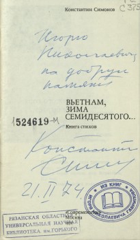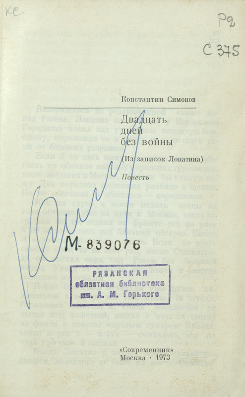 В фонде библиотеки им. Горького в «Коллекции автографов» хранятся книги К. Симонова с автографами автора. Увидеть автографы можно на сканированных изображениях. Все кто интересуется творчеством Симонова, могут легко найти его книги в нашей библиотеке.