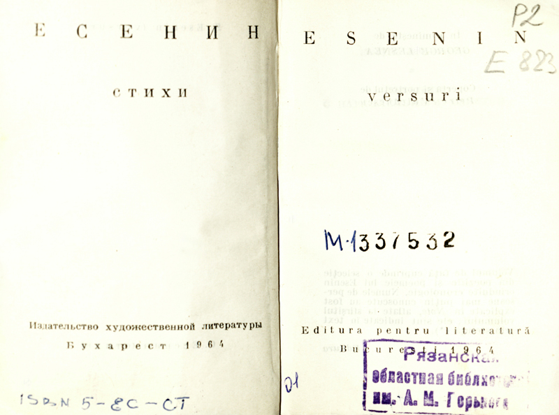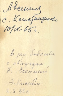 В фонде «Горьковки» хранятся две книги с автографом А.А. Есениной. Одна из них – малоформатный сборник стихов С.А. Есенина, изданный в Бухаресте в 1964 году на русском и румынском языках, с автографом на обороте издательского форзацного листа: «А. Есенина / с. Константиново / 10/IX-65 г.». Бесценный экземпляр был передан областной библиотеке в 1993 году, о чем свидетельствует дарственная надпись Э.К. Киселевой (1935–1997) – прозаика, драматурга, краеведа, сотрудника Рязанского историко-архитектурного музея-заповедника.