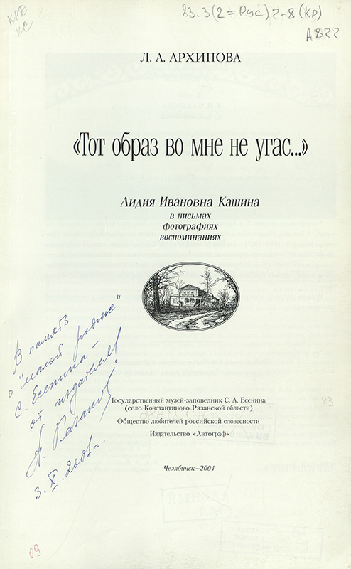 На титульном листе книги автора Л. А. Архиповой «“Тот образ во мне не угас...”: Лидия Ивановна Кашина в письмах, фотографиях, воспоминаниях» (Челябинск, 2001) – памятная надпись руководителя издательского проекта, автора предисловия и послесловия А.Л. Казакова: «В память о “малой родине” С. Есенина – от издателя! 3.10.2001 г.»