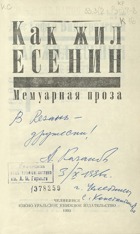 В книге воспоминаний В.Ф. Наседкина «Последний год Есенина» (Челябинск, 1992) – автограф А.Л. Казакова, подготовившего текст к печати и вступительную статью к одной из редких и лучших книг, долгое время находившейся под запретом.