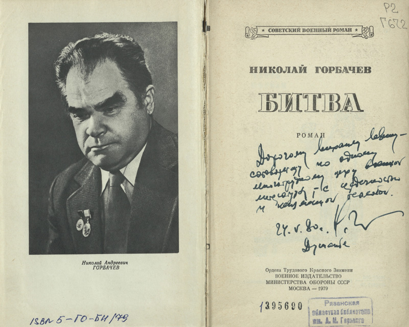 В «Коллекции автографов» хранится книга Николая Горбачева «Битва». На титульном листе читаем: «Дорогому Михаилу Левину – сотоварищу по одному многотрудному цеху военной литературы – с сердечностью и душевной теплотой». Дарственная надпись на книге оставлена Минелю (Михаилу) Иосифовичу Левину (1925 – 2010) – прозаику, поэту, публицисту, который с 1992 по 2010 годы жил и работал в Рязани. В 1999 году книгу из своей личной библиотеки он передал в дар «Горьковке».