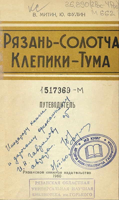 - Митин В.И. Рязань – Солотча – Клепики – Тума : путеводитель / В. И. Митин, Ю. В. Фулин. – Рязань : Ряз. кн. изд-во, 1960. – 159, [1] с.