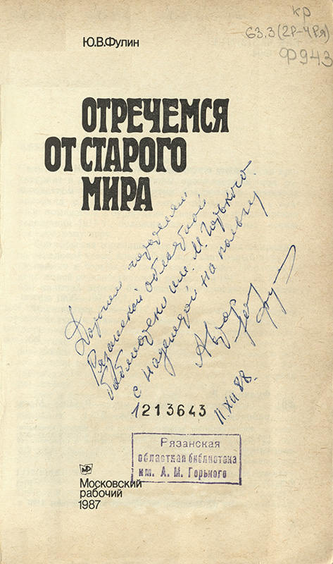 ин-т им. В. И. Ленина, Кафедра истории СССР]. – Москва, 1961. - Фулин Ю. В. Отречемся от старого мира / Ю. В. Фулин. – Рязань : Моск. рабочий, Рязан. отд-ние, 1987. – 238, [1] с.