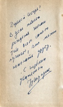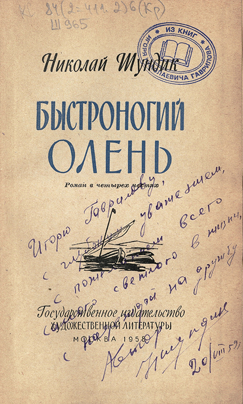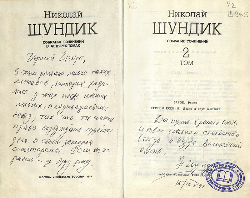 В «Коллекции автографов» «Горьковки» есть три книги с подписью Николая Елисеевича Шундика. На титульном листе романа «В стране синеокой» (1973) есть дарственная надпись: «Юрию Ивановичу Суровцеву, с глубоким уважением, с самыми братскими пожеланиями Н. Шундик 26.04.1973 г.». Книга «Древний знак» (1982) имеет инскрипт: «Да пусть сопутствует тебе, дорогой Юрий Иванович, всегда и везде волшебный олень. Спасибо за доброе слово о моем “Древнем знаке”. С глубоким уважением Н. Шундик 31.05.1983 г.». Книги из коллекции Юрия Ивановича Суровцева (1931–2001) – литературоведа, литературного критика, переводчика – поступили в фонд главной библиотеки рязанского региона в 2018 году.
