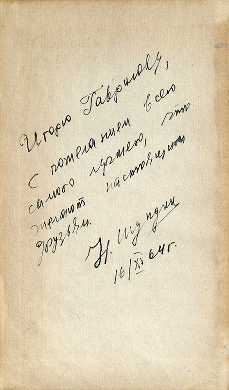 Автограф «Игорю Гаврилову, с пожеланием всего самого лучшего, что желают настоящим друзьям. Н. Шундик 16.11.1964 г.» сохранился на титульном листе романа «Родник у березы» (1964), он адресован Игорю Николаевичу Гаврилову (1926–2003) – видному ученому-литературоведу, известному деятелю культуры Рязанского края, профессору, основателю рязанского литературного краеведения, наставнику плеяды рязанских поэтов и писателей. Коллекция его книг получена в дар библиотекой от его семьи в 2013 году.