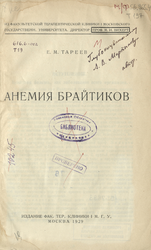В «Коллекции автографов» нашей библиотеки хранится книга Евгения Михайловича с автографом, который адресован российскому хирургу, ученому-медику, уроженцу Рязанской губернии Алексею Васильевичу Мартынову. Библиотека располагает подборкой книг из личной библиотеки А.В. Мартынова, которая поступила к нам из фонда Рязанской научной медицинской библиотеки. Увидеть автограф Е.М. Тареева можно на сканированном изображении.