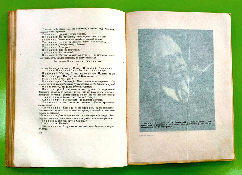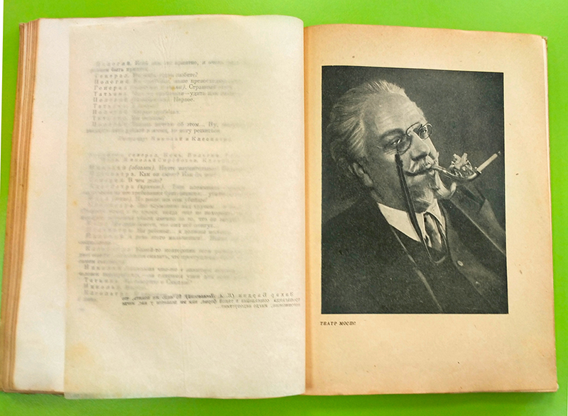 Примечательно, что иллюстрации закрыты папье-плюр (защищающими листами кальки), на которых есть надписи имен персонажей спектакля, фамилии актеров и цитаты из текста произведений.