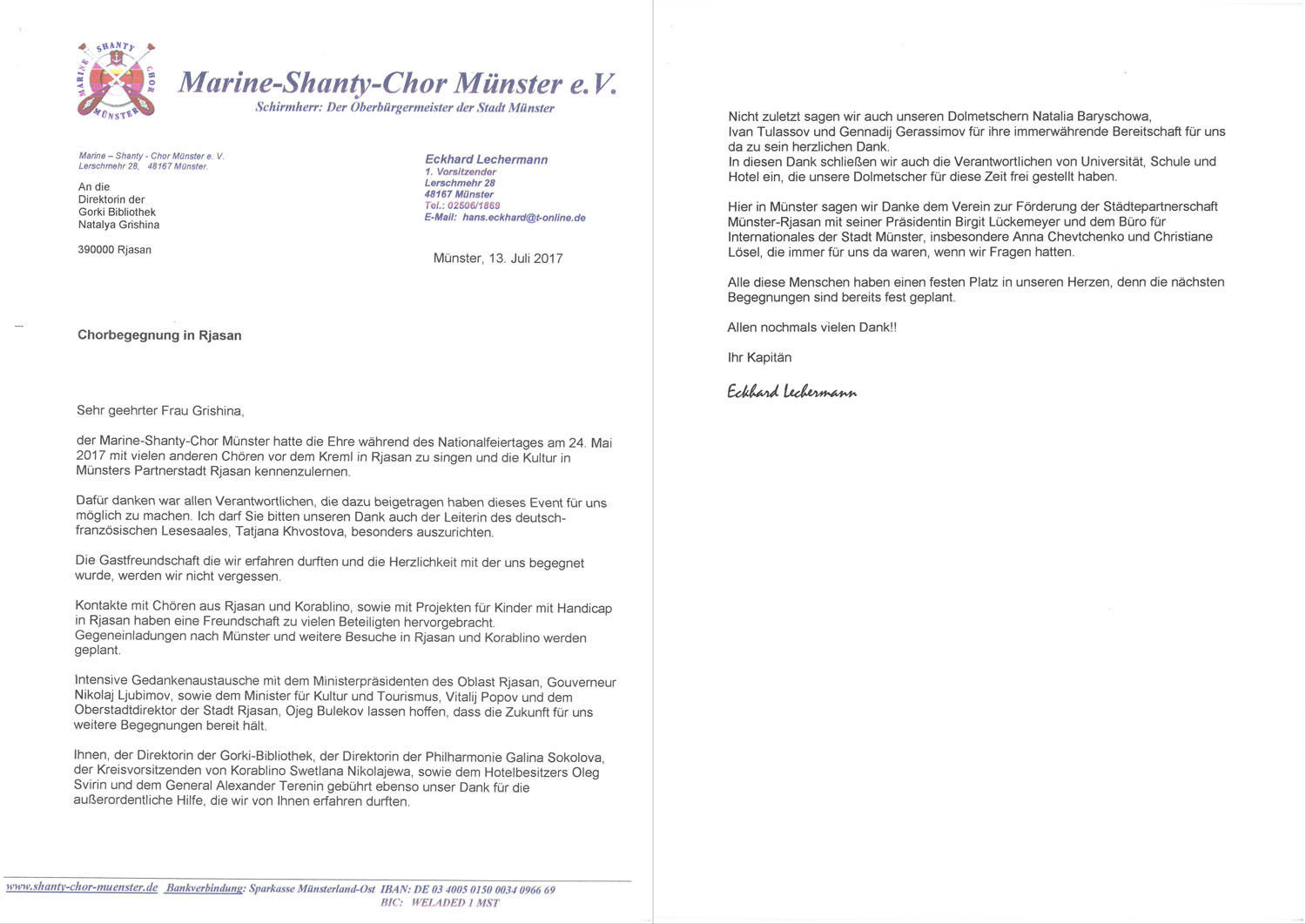 В библиотеку поступило письмо за подписью главы коллектива мюнстерского Шанти-хора Экхарда Лехерманна с теплыми словами благодарности в адрес администрации города и области, директора библиотеки Н.Н. Гришиной, а также всех тех, кто оказывал хору всестороннюю поддержку. Гости из Мюнстера подчеркнули важность проведения подобного рода мероприятий для укрепления международных отношений между Россией и Германией, для дружеских связей между городами-партнерами. Участники хора выразили надежду на продолжение плодотворного двустороннего сотрудничества и сообщили, что уже планируют новые визиты в наш гостеприимный город.