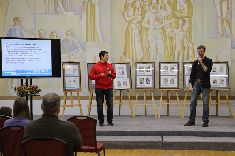 Наши гости подробно рассказали об основных этапах, без которых не обходится работа над созданием профессионального комикса, таких, как поиск идеи, написание сценария, продумывание композиции, качественно выполненная раскадровка и др. Ведущие отметили, что ещё на этапе идеи очень важно сразу придумать, чем будет заканчиваться рисованная история, так как хорошая концовка определяет общее впечатление от всего произведения в целом! Кроме этого они поделились множеством профессиональных лайфхаков, например, как лучше располагать текст в комиксе.