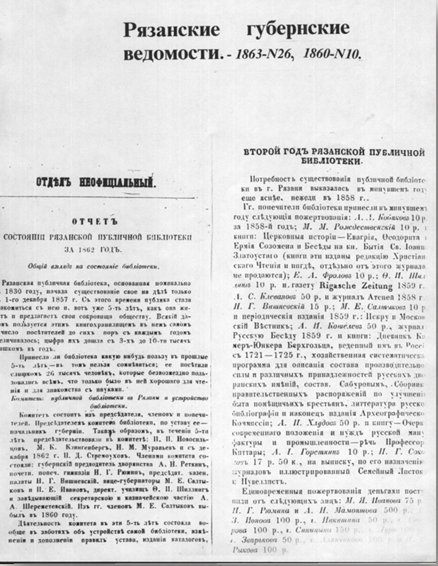 Прибыв в Рязань в апреле 1858 г., М. Е. Салтыков-Щедрин интересовался работой библиотеки, был членом ее Попечительского совета (1858-1859 гг.). По отчету библиотеки за 1858 г. в списке пожертвовавших деньги значится имя М. Е. Салтыкова. По отчету за 1859 г. видно, что он жертвует библиотеке 10 рублей и журналы «Искра» и «Московский вестник» за тот же год. Очень активно участвовали в пополнении фонда библиотеки «Рязанские губернские ведомости», общее руководство которыми Салтыков-Щедрин осуществлял: редакция бесплатно передавала библиотеке свою газету и поступившие в обмен на нее другие периодические издания.