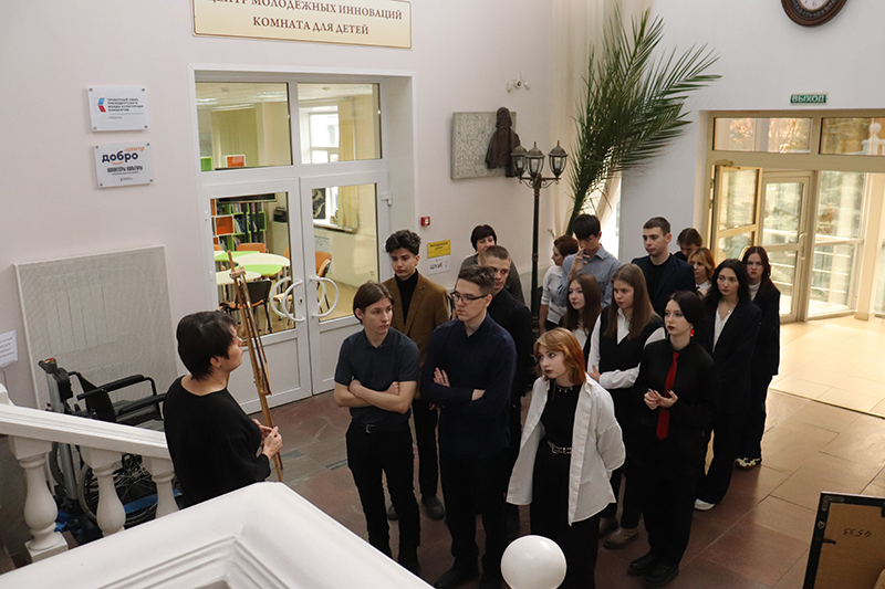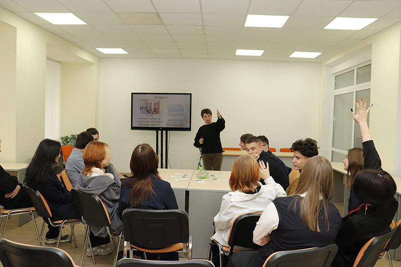 После расшифровки аббревиатуры названия нашей библиотеки и общей информации экскурсанты отправились знакомиться с залами и отделами рязанской «Горьковки». Попадая из прошлого в будущее, они отметили, что дух времени присутствует в каждом корпусе и несет свой отпечаток на оформлении интерьера.