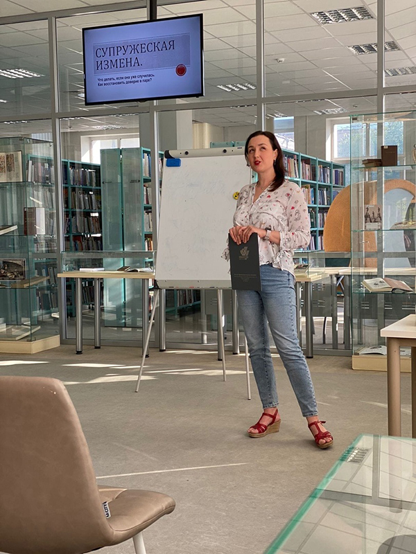 В библиотеке имени Горького в рамках социального проекта «Психологическая поддержка семьи в условиях повышенной напряженности, мировой нестабильности и перемен» состоялась вторая часть лекции «Супружеская измена. Что делать, если она уже случилась. Как восстановить доверие в паре?», которую прочитала семейный психолог, гештальт-консультант, психодраматист Любовь Лавренева.