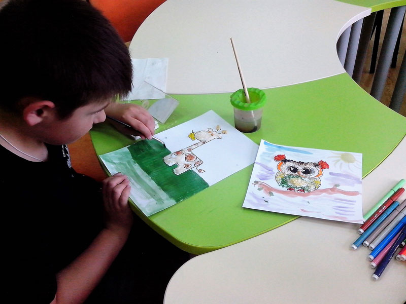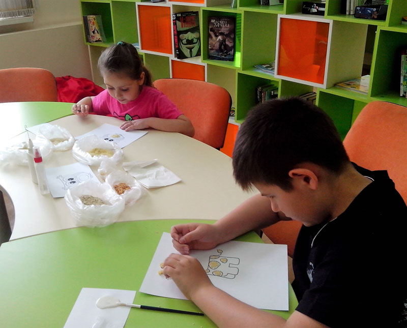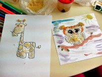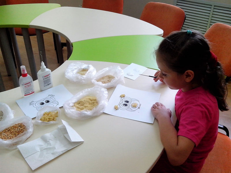 На мастер-классе в «Сказочном домике» мы распечатали картинку на картонной основе, приготовили клей ПВА с кисточкой, фломастеры и краски. Элемент картинки покрыли тонким слоем клея с помощью кисточки, присыпали разными крупами, а сверху чуть примяли пальчиками. Таким же образом обработали и остальные элементы. После полного высыхания лист бумаги нужно перевернуть, чтобы отпали неприклеившиеся крупиночки.