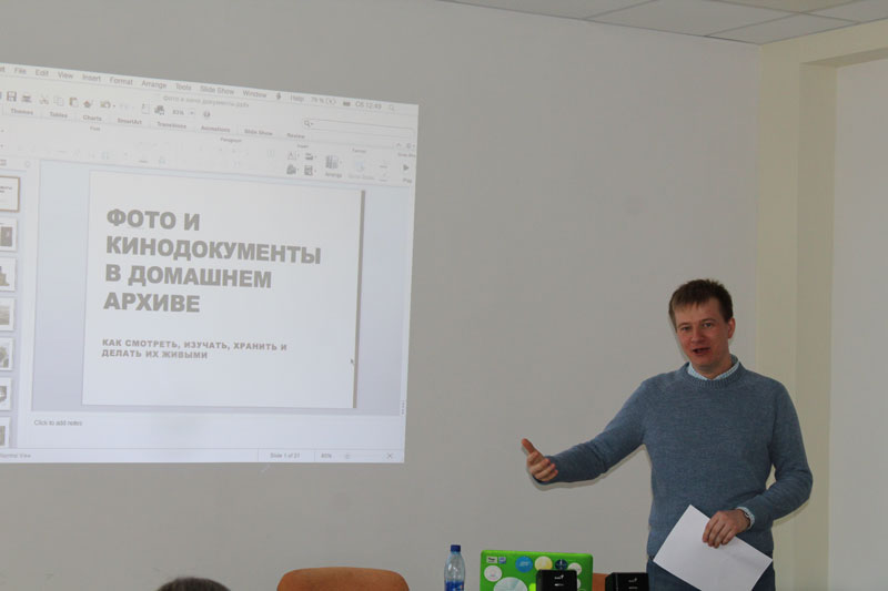 Ведущий поделился опытом работы с фото- и киноисточниками своей семьи, дал ценные советы о правилах хранения фотографий, негативов и кинопленки, представил для просмотра ролик о том, как оцифровать негативы в домашних условиях, используя подручные средства.
