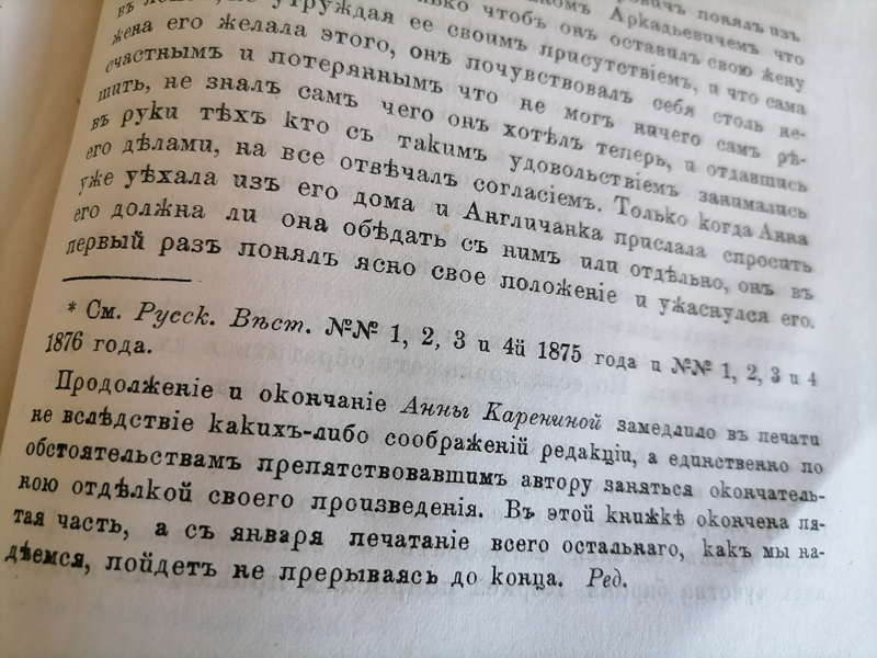 В итоге финал Толстому пришлось выпустить отдельной книгой. В следующем, 1878 году, роман выходит отдельным трёхтомным изданием.