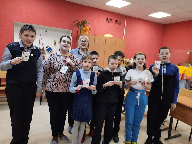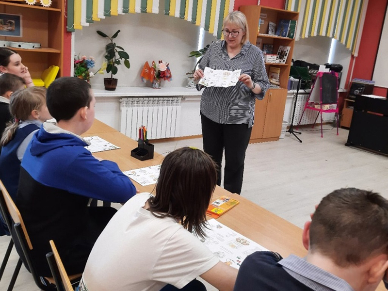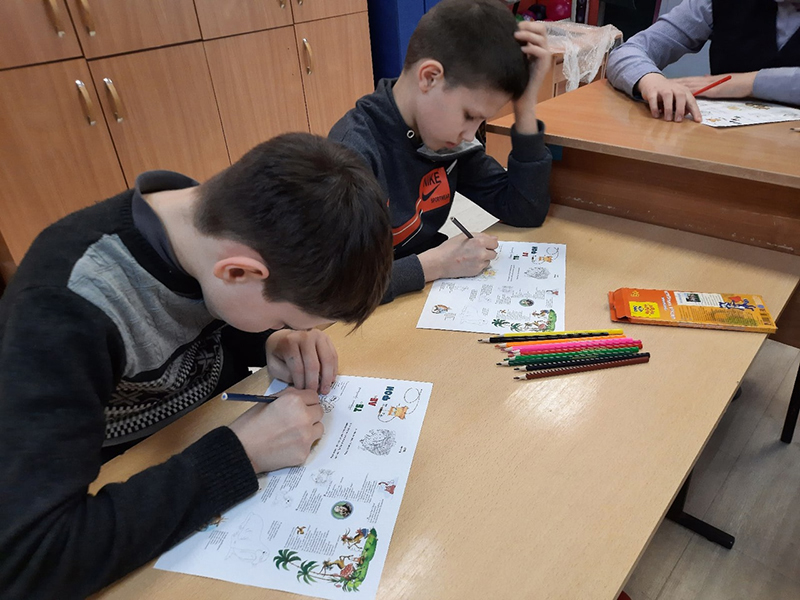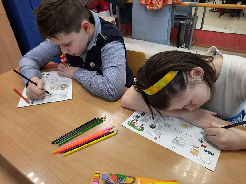 В январе воспитанники интерната приходили в гости в библиотеку знакомиться с рисунками детских иллюстраторов, и вот теперь библиотекари пришли в гости к ребятам, чтобы они своими руками смогли сделать книжку с картинками. Девчонки и мальчишки с удовольствием раскрашивали картинки, иллюстрирующие сказку Корнея Ивановича Чуковского «Телефон», учились правильно подбирать цвета в зависимости от того, какого героя они изображают. Книжка должна была получиться маленькой, размером с детскую ладонь, поэтому и картинки в ней были небольшого размера.