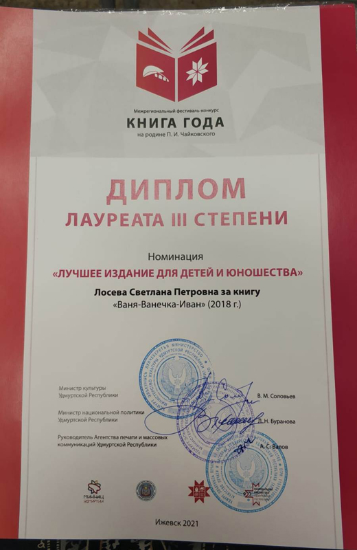 В числе достойных изданий жюри конкурса отметило и книги из Рязани. В номинации «Лучшее издание для детей и юношества» дипломом лауреата конкурса III степени была отмечена книга Светланы Лосевой «Ваня-Ванечка-Иван».