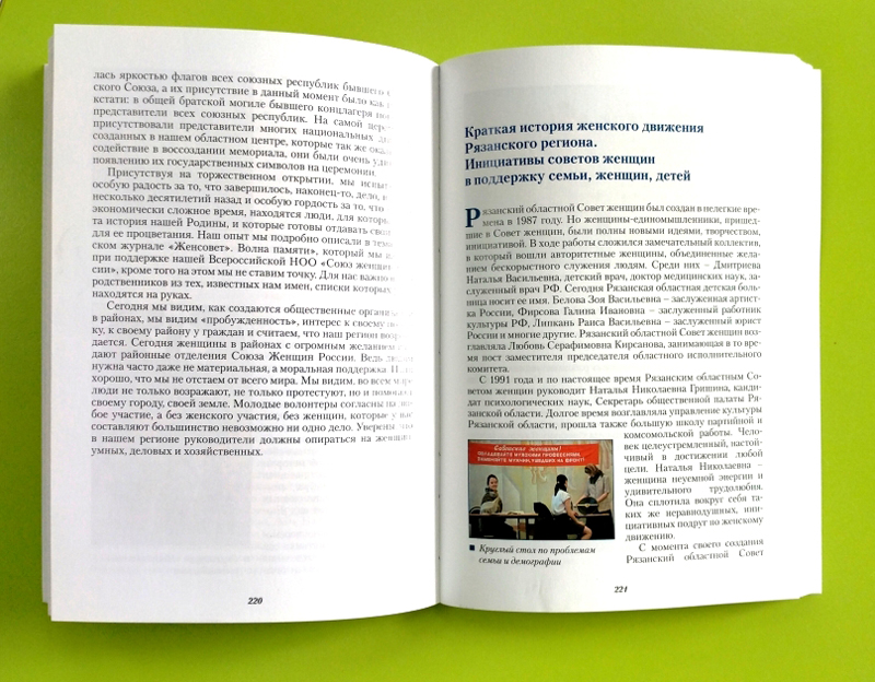 На выставке представлен сборник «О прошлом и настоящем во имя будущего», вышедший к юбилею Общероссийской общественно-государственной организации «Союз женщин России» - правопреемника основанного в сентябре 1941 года Антифашистского комитета советских женщин. Книга знакомит с материалами ряда региональных отделений Союза: Алтайского края, Республики Адыгеи, Владимирской, Иркутской, Костромской и других областей. Среди них опубликована статья «Краткая история женского движения Рязанского региона. Инициативы советов женщин в поддержку семьи, женщин, детей» о деятельности Рязанского областного Совета женщин, который более 30 лет возглавляет необыкновенно целеустремленный, энергичный и трудолюбивый человек - Наталья Николаевна Гришина, сплотившая вокруг себя единомышленниц.