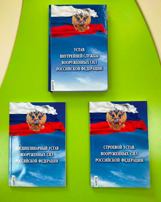 Наступит тот торжественный момент, когда нынешние юные патриоты торжественно будут произносить слова Присяги Родине, начиная проходить службу в рядах Вооруженных Сил Российской Федерации. Эти повзрослевшие юноши – наша надежа и будущие защитники нашего Отечества! Для них и военнослужащих, проходящих службу по призыву и по контракту, мы представили на выставке полные тексты Уставов, опубликованных в 2023 году: «Устав внутренней службы Вооруженных Сил РФ», «Дисциплинарный устав Вооруженных Сил РФ», «Строевой устав Вооруженных Сил РФ».