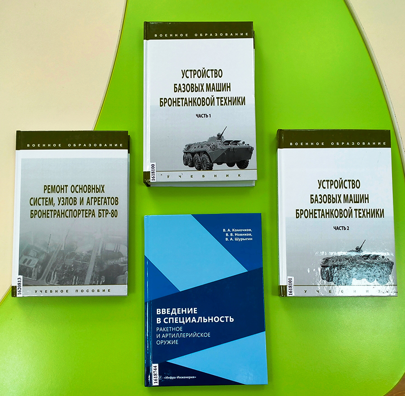 Для профессиональной подготовки офицеров, курсантов военных училищ и слушателей военных кафедр вузов представляем серию «Военное образование», в которой вышли новые учебники: «Устройство базовых машин бронетанковой техники» (в 2-х книгах), где рассмотрены конструкции образцов отечественного бронетанкового вооружения; изложены боевая и техническая характеристика основного танка Вооруженных Сил РФ – Т-72. Учебное пособие «Ремонт основных систем, узлов и агрегатов бронетранспортера БТР-80» излагает последовательный порядок проведения работ при замене и ремонте механизмов бронетранспортера БТР-80. В издании «Введение в специальность. Ракетное и артиллерийское оружие» приведены образцы и технические характеристики военной техники; даны основные направления научно-исследовательской деятельности по ракетной и артиллерийской специальностям.