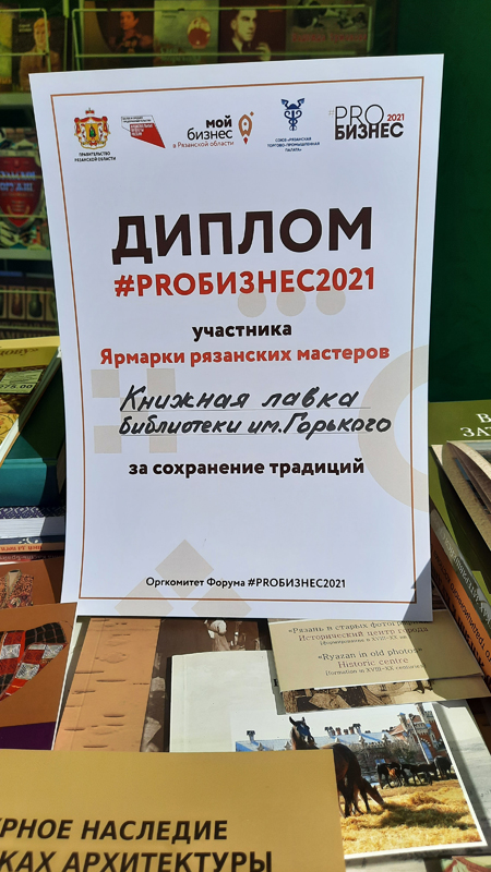 За активное участие в ярмарочной деятельности, сохранение и популяризацию истории традиционных ремесел Рязанского края Книжная лавка библиотеки удостоена Диплома оргкомитета Форума «PROБИЗНЕС – 2021».