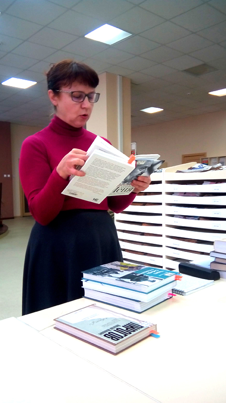 Сотрудники кафедры социально-экономической и гуманитарной литературы Н.В. Баркова, Т.Н. Краснова и В.Н. Волкова провели обзоры книг по актуальным и интересным темам. Наталья Владимировна обратила особое внимание на серию книг о философах, Татьяна Николаевна заострила внимание на новой книге об А. Мене, а Вера Николаевна попросила нас заботиться о своем здоровье, порекомендовав книгу о лечении позвоночника.