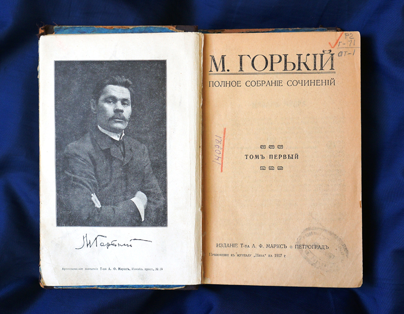 В нашей библиотеке год от года растет количество изданий произведений писателя и материалов о нем. В настоящее время коллекция «Фонд Максима Горького» содержит 1380 книг, среди которых есть и прижизненные издания писателя: «Рассказы» (1901), «Землетрясение в Калабри и Сицилии» (1909), «Лев Толстой. А.П. Чехов. В.Г. Короленко» (1928), «О писателях-самоучках» (1928), «Детство» (1937).